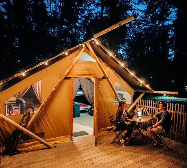 At the foot of Mont Sutton in the Eastern Townships, Huttopia Sutton chalets welcome you, with full access to all Hôtel Horizon amenities.